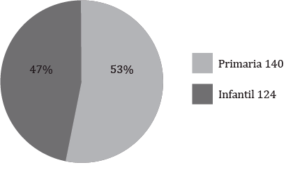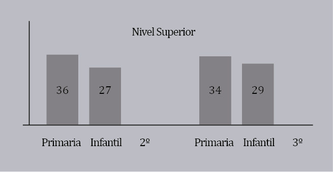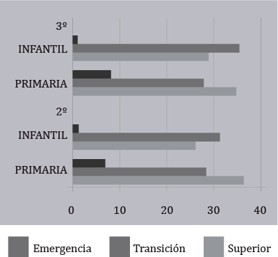 Mientras que el alumnado del grado de Educación Primaria, que se sitúa en el nivel superior, es poco mayor que el de Infantil (50% frente a 45%), el que se ubica en el nivel de emergencia es significativamente mayor (10% frente a 1%); esto equivale a un nivel peor de eficacia lectora del alumnado de Primaria frente al de Infantil, ya que 14 alumnos de los 16 del nivel de emergencia son de Primaria frente a solo dos de Infantil.