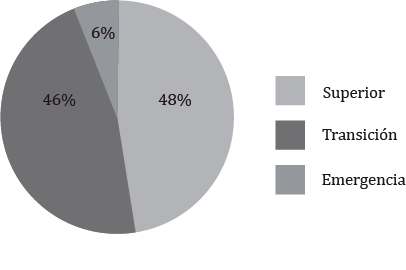 El 93.94% de los estudiantes obtuvieron resultados que los sitúan en los niveles superior o de transición (entre 48 y 64 o entre 32 y 48 aciertos, respectivamente). Llama la atención que el 6.06% restante (un total de 16 alumnos de la muestra) se ubica en el nivel de emergencia, con un número de aciertos que, como máximo, solo llega a la mitad de los ítems, como queda reflejado en la gráfica 4.