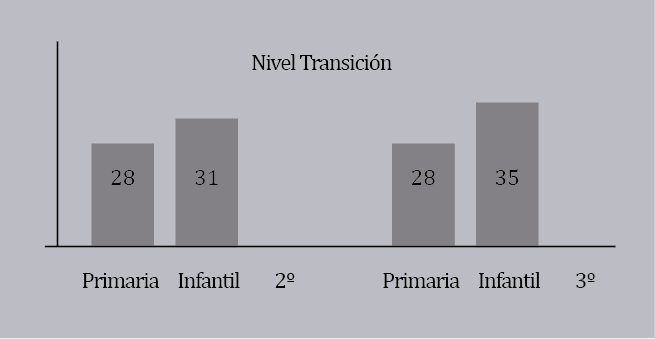 Por último, aunque el alumnado de Educación Infantil obtuvo mejores resultados en lectura eficaz, en comparación con el de Primaria, llama la atención que la mayoría del alumnado de los cursos 2º y 3º de Infantil se encuentra en el nivel de transición, mientras que la mayoría del alumnado de esos mismos cursos de Primaria se encuentra en el nivel superior.