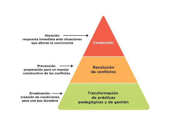 Un aporte importante desde esta perspectiva proviene de Kathy Bickmore (2011), investigadora que ha enfocado su atención al análisis de los conflictos escolares, lo que le permitió identificar distintos modos de abordarlos, cada uno de las cuales ofrece mayores o menores oportunidades para construir una paz duradera en las escuelas. Los niveles que propone son peace keeping, peace making y peace buiding, los cuales renombramos, para fines del modelo de convivencia, como contención, resolución de conflictos y transformación de prácticas pedagógicas y de gestión, respectivamente.