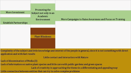 Concerning the contribution of this research proposal, the author presents below, in figures 4 and 5, the two exploratory trees obtained in the focus group with both groups. In those figures, it is expressed the voice of the targeted audience, one original manifesto, which reinforces the proposal of the project´s concept. In light brown, the roots of the tree, are listed the identified causes of the problem “plant blindness” by each group of students, and in green, the identified solutions that may attenuate the inherent problem.