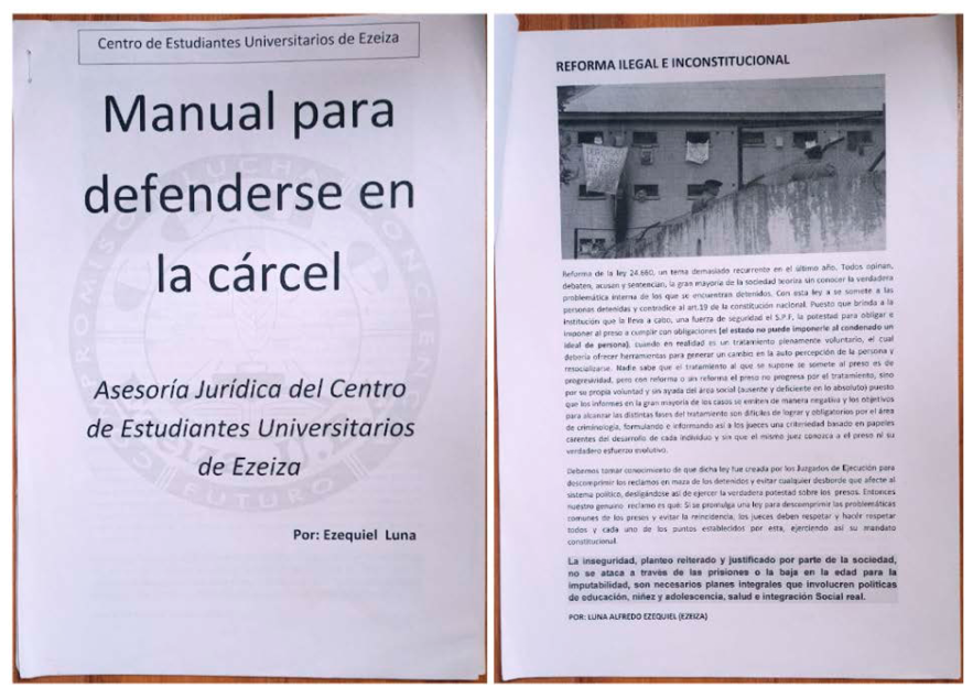 Algunos de estos modelos de documento, junto con otros materiales que Ezequiel elaboró especialmente, compusieron el Manual para defenderse en la cárcel, que compiló, diagramó e imprimió en la flamante Asesoría Jurídica del Centro de Estudiantes Universitarios de Ezeiza, de la que participaba y que impulsó a crear ese mismo año.