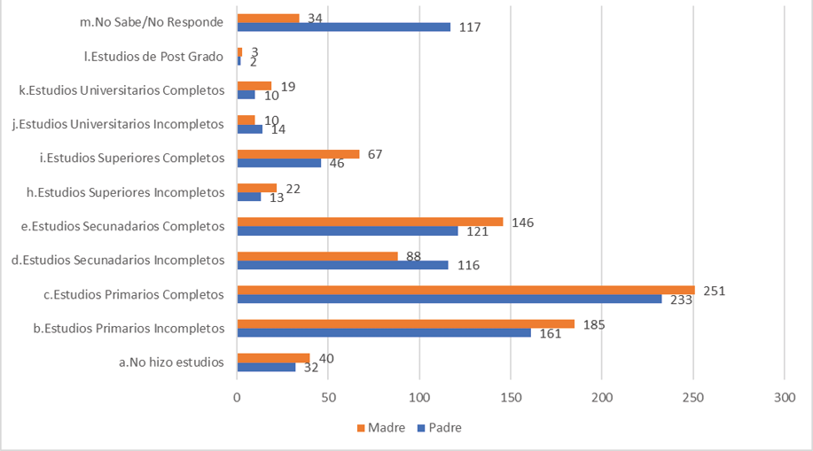Considerando los niveles educativos alcanzados, la educación primaria es el mayor nivel que han cursado y culminado las madres (251) a diferencia de los padres (233). También es significativo el número referido a la no finalización de este nivel. En este caso, los números se invierten, pues 185 madres y 161 padres no lo han concluido. En cuanto al nivel secundario, este ha sido completado por 146 madres y 121 padres; en contraposición, 88 madres y 116 padres no finalizaron la escuela media.
