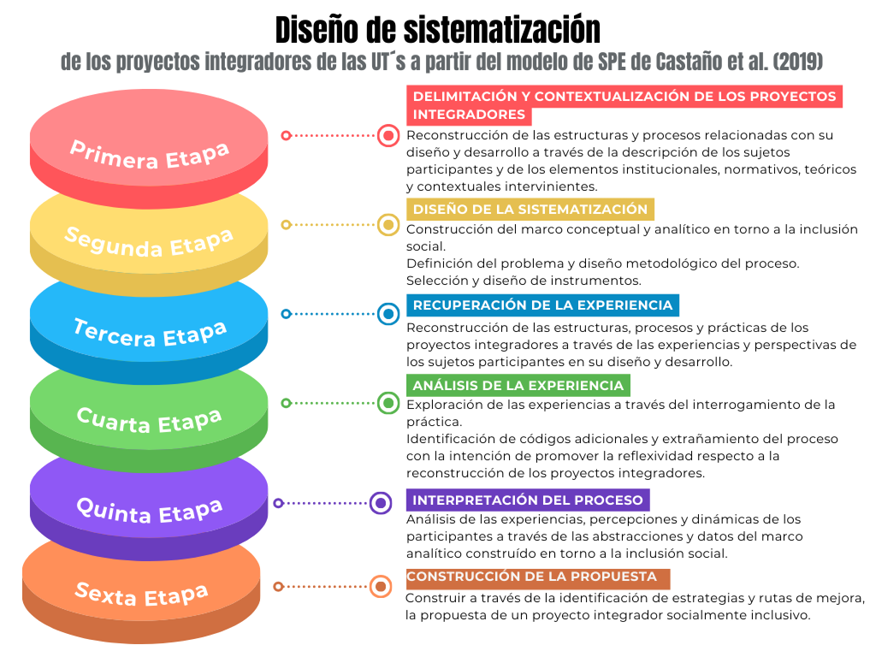 A continuación, y tomando como referencia el modelo de SPE de Castaño et al. (2019), presentamos en la figura el diseño de sistematización propuesto para el tratamiento de los proyectos integradores de las UT.