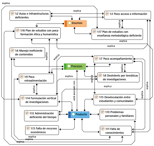 Por otro lado, la formulación vertical de la investigación y el desconocimiento de los estudiantes sobre el proceso investigativo son los factores con mayor cantidad de conexiones dentro del esquema, por lo que deben ser atendidos con mayor urgencia mediante estrategias específicas. Si bien muchos de estos elementos generan efectos en cascada a corto y largo plazo, y no siempre existe una relación estrictamente causa-efecto entre ellos, esta aproximación permite comprender de manera sistémica los vínculos entre los distintos factores identificados.