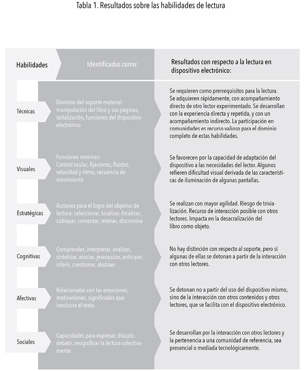 Los resultados indicaron que las habilidades técnicas se desarrollan con la experiencia directa y repetida, y con la interacción con otros lectores, quienes se convierten en recurso valioso para el dominio completo de estas habilidades. La capacidad de adaptación del dispositivo a las necesidades del lector favorece las habilidades visuales en lo general. Las habilidades estratégicas se realizan con mayor agilidad; impactan en la desacralización del libro como objeto de culto y son un recurso de interacción con otros lectores. En cuanto a las habilidades cognitivas, no hay distinción referida al soporte, pero sí observamos que algunas de ellas se detonan a partir de la interacción con otros. Lo mismo ocurre con las afectivas y sociales, que no se desarrollan solo por el dispositivo electrónico en sí, sino por la interacción con otros lectores y la pertenencia a comunidades de referencia. La tabla 1 sintetiza estos resultados.
