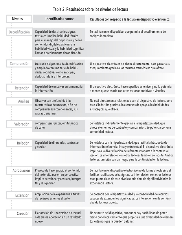 El dispositivo electrónico impulsa la diversificación de referentes y aporta a la contextualización; se fortalece con la hipertextualidad, pues facilita la búsqueda de información referencial intra- y extratextual, así como la interrelación social. A decir de los lectores, esto constituye también un riesgo para la concentración y continuidad en la lectura. Por su parte, el nivel de apropiación se facilita con el dispositivo electrónico no de modo directo, sino al promover habilidades estratégicas. La interrelación con otros lectores es punto clave de este nivel cuando dota de significatividad a la experiencia lectora. La extensión se potencia por la hipertextualidad y la conectividad de recursos, capaces de extender los significados. La interacción con la comunidad de lectores aporta.