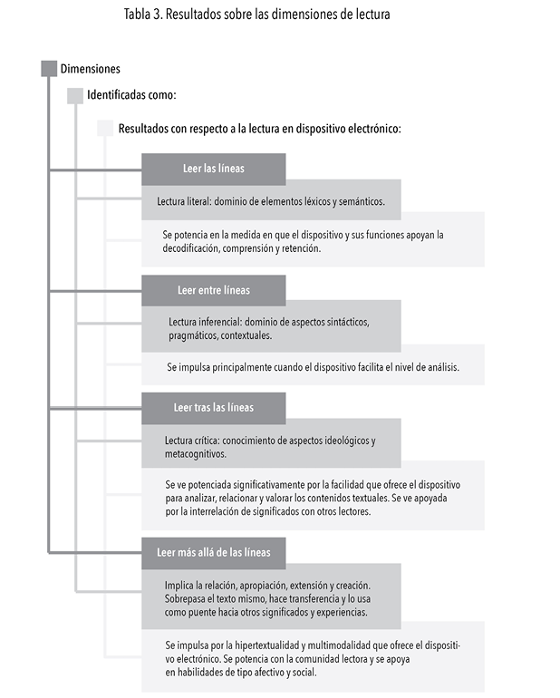A esta dimensión, distinta de las categorizadas antes, la denominamos lectura más allá de las líneas. Su contundente presencia en la experiencia de los lectores, tanto en las entrevistas como en el grupo focal, nos llevó a descubrir que aun cuando puede realizarse en cualquier tipo de texto y de soporte, sí se ve impulsada con fuerza por el uso de dispositivos electrónicos debido a las características de hipertextualidad y multimodalidad. Por otra parte, ir más allá de las líneas es una dimensión que la pertenencia a una comunidad lectora potencia y que está apoyada sobre todo en habilidades de tipo afectivo y social. Estos resultados, al respecto de las dimensiones de la lectura, se sintetizan en la tabla 3.