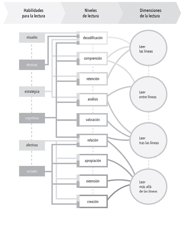 Los niveles de lectura, así como las habilidades, no son independientes entre sí ni siguen secuencias unidireccionales. Más bien se trata de estadios en interacción que pueden irse alcanzando a través de diferentes rutas, muchas veces de forma simultánea, con efecto sinérgico y recursivo. El grado de dominio de los diversos niveles va apuntando a alcanzar nuevas dimensiones de la lectura. Cassany (2012) distingue tres de ellas: la lectura literal (leer las líneas), la lectura inferencial (leer entre líneas) y la lectura crítica (leer tras las líneas).