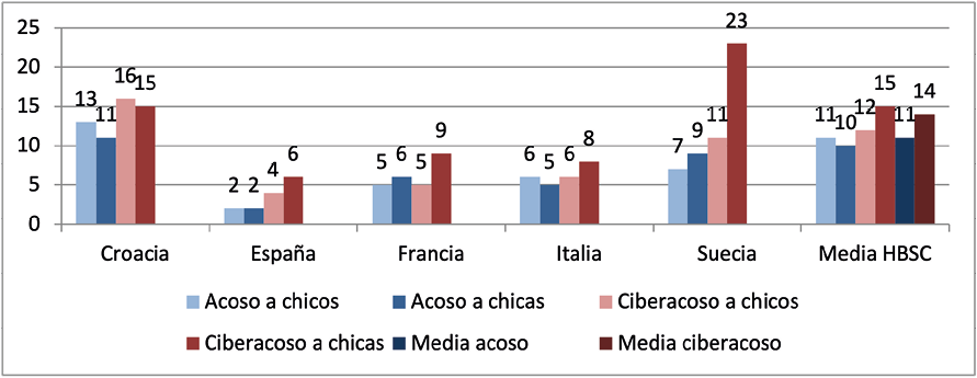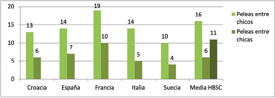 La comparación entre países en las gráficas 1 y 2 permite observar algunos patrones comunes, como la prevalencia de las peleas entre chicos (entre seis y nueve puntos más que en las peleas entre chicas) o la prevalencia del ciberacoso entre chicas, con patrones algo distintos entre los países analizados.