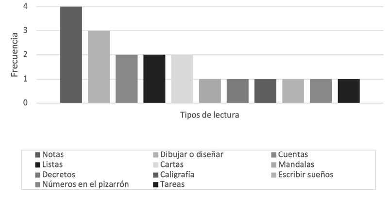 Haciendo caso de las propuestas de Zavala (2008) para los usos de la lectura y la escritura, se retoma que, más allá de la escuela, no son fines en sí mismos: uno no lee o escribe para leer y escribir, sino, al contrario, “son formas de lograr objetivos sociales y prácticas culturales más amplios” (p. 24). Como afirman Cassany y Castellà (2010), la propuesta sociocultural otorga mucho valor a las denominadas “prácticas letradas vernáculas” o autogeneradas, es decir, a las formas de lectura y escritura que desarrolla por su cuenta el aprendiz en contextos privados. Una primera literacidad vernácula en el Cereso podría pensarse en “Lápiz de protesta” y “Sin censura”, pequeños espacios dentro del periódico mural del penal, en los que las PPL pueden “mostrar” sus inquietudes, molestias, literatura, discursos en contra de las instituciones, etcétera; es un lugar de demanda social que las PPL protegen, escriben y leen. En la gráfica 2 observamos lo que los participantes comparten respecto a sus escrituras cotidianas dentro del penal.