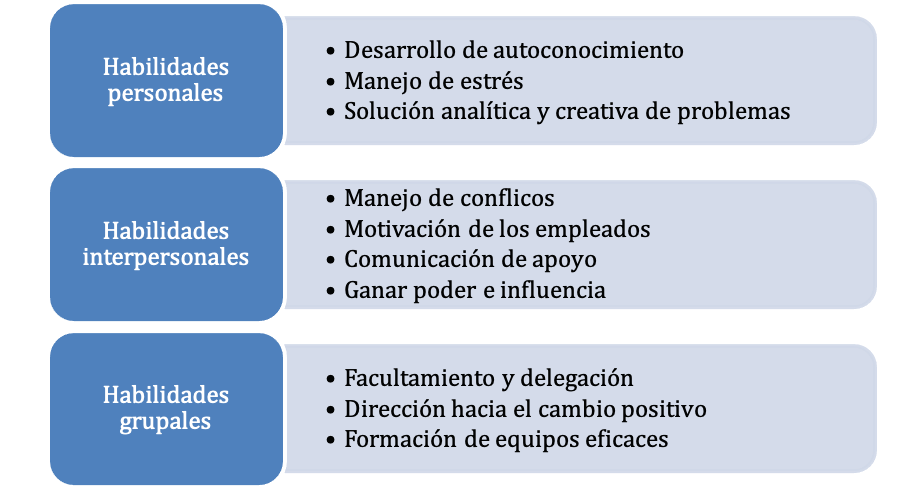 Las habilidades personales se concentran en asuntos que quizá no impliquen a otras personas, sino que se relacionan con el manejo del propio yo; las habilidades interpersonales se refieren principalmente a asuntos que surgen al interactuar con otras personas, mientras que las grupales se centran en asuntos fundamentales que surgen cuando un individuo participa con grupos de personas ya sea como líder o como miembro del grupo (Whetten y Cameron, 2011).