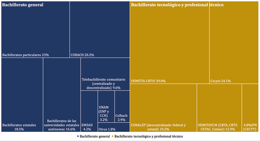 Al analizar cómo se distribuyó la matrícula en cada institución y modelo educativo en el ciclo 2021-2021 se tiene que, en el caso de la Ciudad de México, la institución que tuvo una mayor participación en el porcentaje de estudiantes inscritos es la UNAM. Esto sobre otras instituciones de relevancia, como el Colegio de Bachilleres (Colbach) o el Instituto de Educación Media de la Ciudad de México.