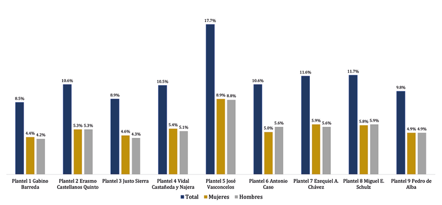 En cuanto a la población académica que conforma este subsistema, datos de la Dirección General de Administración Escolar de la UNAM señalan que, en el ciclo escolar 2021-2022, se registraron un total de 48,492 estudiantes, de los cuales el 50.3% fueron mujeres y 49.7%, hombres. Esta población fue atendida por 3,079 docentes (DGP, 2022). En la gráfica 1 se muestra la distribución de la población escolar por plantel.