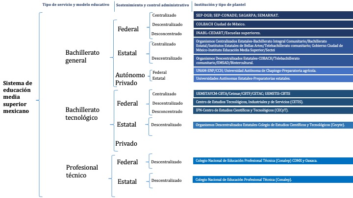 Estos modelos, cuyas características responden tanto a distintas racionalidades pedagógicas como a diferentes formas de organización político-administrativas, se ofrecen en una amplia variedad de instituciones o sistemas que pueden estar bajo distintas opciones de control operativo o formas de sostenimiento; entre ellas, se encuentran las centralizadas y descentralizadas del gobierno federal, las centralizadas y descentralizadas de las entidades federativas, las que dependen de las universidades autónomas federales y estatales, las que son subsidiadas (con financiamiento mixto) o las escuelas privadas, además de la oferta a distancia y de preparatoria abierta (SEP, 2008; INEE, 2018).