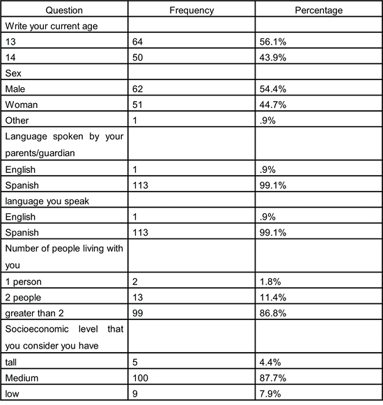 The survey collected sociodemographic information and background of the participants in this study. The analyses focused on the frequencies of answers to interpret the different sections and questions presented to the secondary learners. The first results were the following ones: