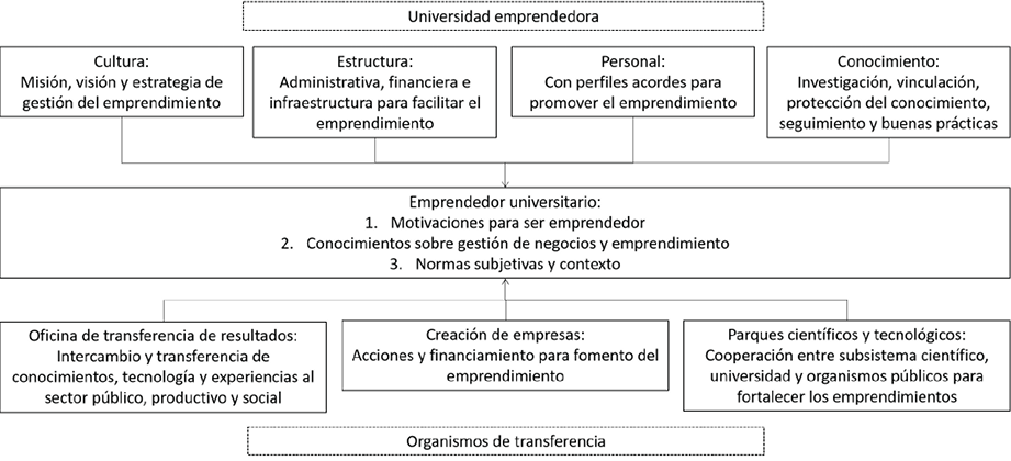 Figura 1. Modelo de gestión de la universidad emprendedora. Fuente: Elaboración propia con base en Damián (2020).