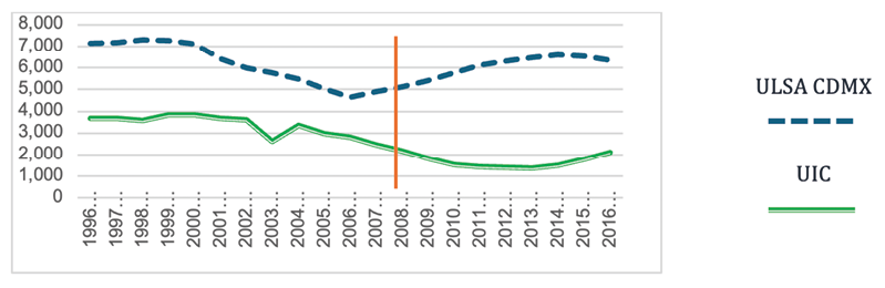 En los dos casos analizados, la matrícula de licenciatura logró revertir su tendencia a la baja, aunque de manera diferenciada y coincidiendo circunstancialmente con su participación en procesos de acreditación. La ULSA CDMX inició un decrecimiento en el ciclo 1999-2000, pero logró revertirlo hacia el ciclo 2007-2008. La UIC, en cambio, mantuvo la pérdida de matrícula desde 1996-1997 hasta 2014-2015, cuando comenzó una recuperación (véase gráfica).
