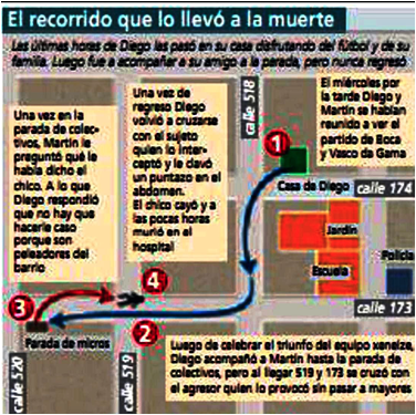 La imagen 1 revela el trayecto de una víctima de un episodio de violencia al salir de la escuela. A partir de un plano horizontal sin perspectiva se representan las nueve cuadras donde se desarrolló el hecho; la casa del estudiante destacada en color verde; la escuela marcada con color amarillo; la policía señalada con color azul; el trayecto del estudiante a través de flechas; y el lugar donde fue hallado el cuerpo. El gráfico y los textos que la acompañan sintetizan de manera figurativa el camino vivido por el joven antes de su fallecimiento. Utilizamos flechas de colores para marcar el movimiento del estudiante: azul para exponer los primeros movimientos y roja para mostrar su último desplazamiento.