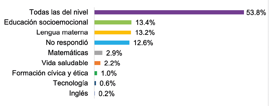 El 53.8% (n=264) de los participantes puntualizaron que en la planeación consideran los aprendizajes esperados de todas las asignaturas correspondientes del grado y nivel educativo a su cargo; el 13.4% (n=66) priorizan los aprendizajes de la educación socioemocional; el 13.2% (n=65), de español; el 2.9% (n=14), de matemáticas; el 2.2% (n=11), los contenidos de vida saludable; el 1% (n=5), de formación cívica y ética; el 0.6% (n=3), de tecnología; y el 0.2% (n=1), la asignatura de inglés (ver gráfica 1).