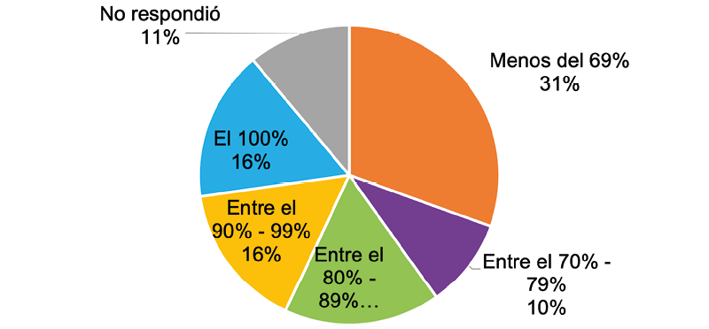 Con la estrategia de educación a distancia “Aprende en Casa II”, el gobierno mexicano, con la coordinación de la SEP, diseñó la producción del programa televisivo que conforma el contenido educativo específico como apoyo al aprendizaje del alumnado en casa. La SEP determinó esos programas como la base del trabajo educativo durante la pandemia; ante esta premisa, se preguntó al profesorado sobre la promoción del uso del servicio televisivo y se obtuvo que el 31% de los docentes (n=149) han promovido su uso en menos del 69% de sus sesiones; 27% (129 profesores), entre el 70% y el 89% de las veces; 32% (n=156), entre el 90% y el 100%; el 11% restante no respondió a esta pregunta (ver gráfica 2).