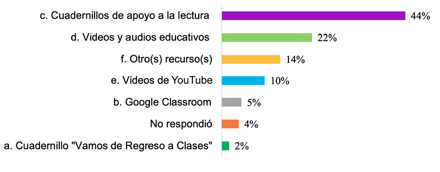 El 100% del profesorado indicó estar ejerciendo su práctica pedagógica a distancia; ninguno ha experimentado enseñanza híbrida durante la contingencia sanitaria por la COVID-19. Con la finalidad de garantizar el aprendizaje en el alumnado, además de las actividades propuestas en los libros de texto gratuito y la barra de contenidos en el programa televisivo Aprende en Casa, el 44% de docentes participantes han diseñado y entregado cuadernillos de apoyo de lectura-escritura y pensamiento matemático para quienes están en situación de vulnerabilidad por condición de discapacidad o trastorno, que no tienen acceso a internet o no cuentan con herramientas tecnológicas; el 22% elabora videos y audios educativos; el 10% se apoya en videos educativos de YouTube; el 5% se auxilia en la plataforma de Google Classroom para promover las actividades de los aprendizaje esperados; el 2% promueve y soporta su enseñanza en el cuadernillo titulado Vamos de regreso a clases, impulsado por la SEP; el 14% refiere otros tipos de recursos; y el 4% no contesó.