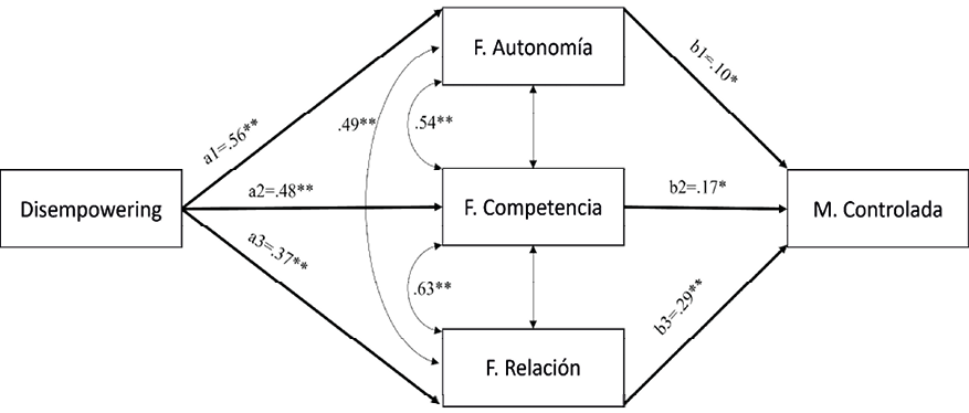 Figura 2. Modelo clima disempowering –frustración de las tres NPB–, motivación controlada.