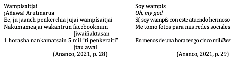 En estos versos, la interculturalidad se evidencia en las expresiones propias del mundo globalizado, ya que en la versión castellana se utilizan vocablos del inglés como Oh, my god y likes, que se han normalizado en la sociedad peruana actual, a la que también pertenece la voz poética, que se comporta según sus modelos de conducta, como el tomarse fotos para publicarlas en las redes sociales. Asimismo, si comparamos la versión wampís con la castellana, advertimos que, en el plano lingüístico, la cultura occidental ha sido asimilada en la cultura wampís mediante el uso de préstamos lingüísticos en las expresiones “facebooknum”, “horasha” y “mil”. Además, contrasta la referencia al Facebook en la versión wampís con la nominación genérica de “redes sociales” en la versión castellana.