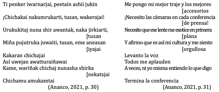 A partir de los versos citados, el elemento que nos permite reforzar el planteamiento de una voz poética definida como intelectual wampís es la “conferencia de prensa”. Consideramos que este evento es utilizado como símbolo de la comunidad académica que busca conocer la cultura wampís, a la cual pertenece la voz poética y habla en representación de ella. En este contexto, se entiende la importancia del vestirse con los atuendos tradicionales, ya que le permiten posicionarse con orgullo como mujer wampís frente al público ajeno a su comunidad. A su vez, esto demuestra en el plano simbólico el diálogo intercultural que se establece entre la cultura wampís con la occidental, mediado por la figura de la intelectual indígena, intérprete de su comunidad y saberes ancestrales. No obstante, esta situación se problematiza al manifestar que ni ella misma entiende lo que dice en la conferencia, lo cual se puede interpretar como la incertidumbre ocasionada por su constante movilización entre dos mundos.