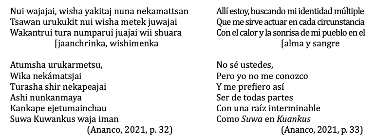 Como observamos, se destaca más la forma de representar y articular los cantos tradicionales wampís en los poemas, e incluso se identifica la presencia de la cultura awajún que se entremezcla con la wampís en lo que podríamos entender como el diálogo intercultural entre estas culturas bastante cercanas, cuyo resultado es la presencia de una voz poética wampís-awajún. Esta cuestión es relevante si consideramos que la autora es portadora de los saberes ancestrales de ambas culturas debido a que nació en una comunidad awajún y se crio en una comunidad wampís, a la cual pertenece su familia materna. Asimismo, los autores mencionan que las formas tradicionales wampís-awajún coexisten en la poesía de Ananco con las formas aprendidas en la tradición occidental, de manera que Sanchiu se configura como un espacio de encuentro entre las culturas wampís, awajún y occidental, que definen la identidad de la autora y de la voz poética.