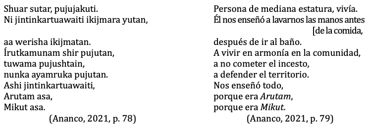 En este sentido, planteamos que el discurso dado por Ananco en sus entrevistas pertenece al lenguaje natural y se proyecta a través de la voz poética en su lenguaje retórico, artístico o poético; es decir, las reflexiones sobre la problemática de la cultura wampís desarrolladas en el lenguaje natural se trasladan al lenguaje literario. Con base en estas consideraciones, a continuación analizamos los poemas “Atumsha urukarmetsu/No sé ustedes” y “Mikut”.