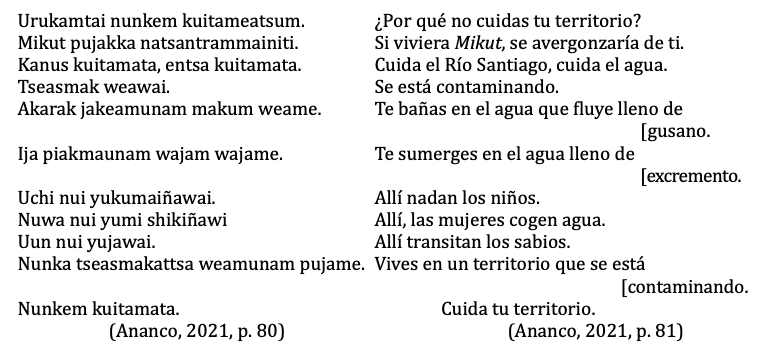 En la cita advertimos que la interpelación que realiza la voz poética se debe a la pérdida de los valores entre los wampís que no cuidan su territorio. En este contexto, la posición de intelectual wampís le otorga autoridad a la voz poética para cuestionar la falta de cuidado del territorio, lo cual se refleja en la contaminación del agua y el desinterés para evitarlo, ya que parece que no le dan importancia al aseo, por tanto, igual se “bañan” en las aguas llenas de gusanos y excrementos. Ante esta situación, la voz poética de intelectual wampís busca sensibilizar a los interlocutores sobre el descuido del territorio. Para ello, les recuerda la figura de Mikut, entendido como el símbolo de la cultura, sabiduría y moralidad wampís, quien se avergonzaría de las nuevas generaciones por no cumplir con sus enseñanzas y misiones.