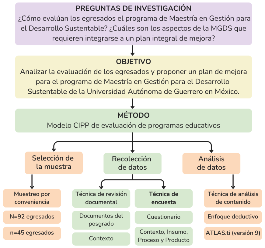 En este contexto, nuestro estudio se propuso evaluar el programa de la maestría en Gestión para el Desarrollo Sustentable (MGDS) de la Universidad Autónoma de Guerrero a partir de la percepción de sus egresados y, con base en los hallazgos, diseñar un plan de mejora que fortalezca la calidad del posgrado y garantizar su alineación con las demandas sociales e individuales a fin de consolidarlo como un espacio de formación relevante y de alto nivel.