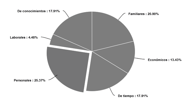 El producto de la MGDS se refiere a los resultados obtenidos tras la operacionalización del programa educativo. Esta salida emergente del sistema puede manifestarse de diversas formas, pero es más evidente en el desempeño y la perspectiva de los egresados, quienes fueron los primeros en recibir la formación. En este contexto, los egresados identificaron los principales problemas que afectaron su desempeño durante el posgrado (véase gráfica). Los más comunes fueron los problemas personales (25.37%), relacionados con enfermedades, aspectos emocionales y dificultades de adaptación. En segundo lugar, señalaron inconvenientes familiares (20.90%), entre los que mencionaron problemas de comunicación, conflictos y presiones derivadas de exigencias y expectativas.